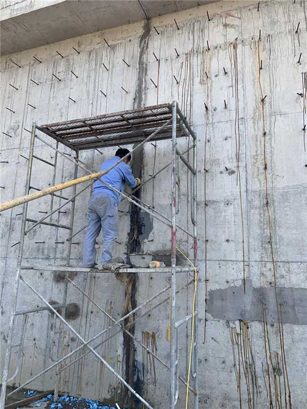 如果是池体施工缝处出现渗漏的话,一定要先找到渗漏水的具体区域,然后对渗水的孔洞、酥松等问题进行堵漏。这时候可以先沿着裂缝开个槽,然后将开槽后产生的垃圾清理干净,水池也需要清洗好,保持槽体的充分湿润。